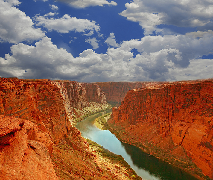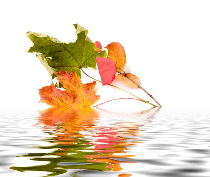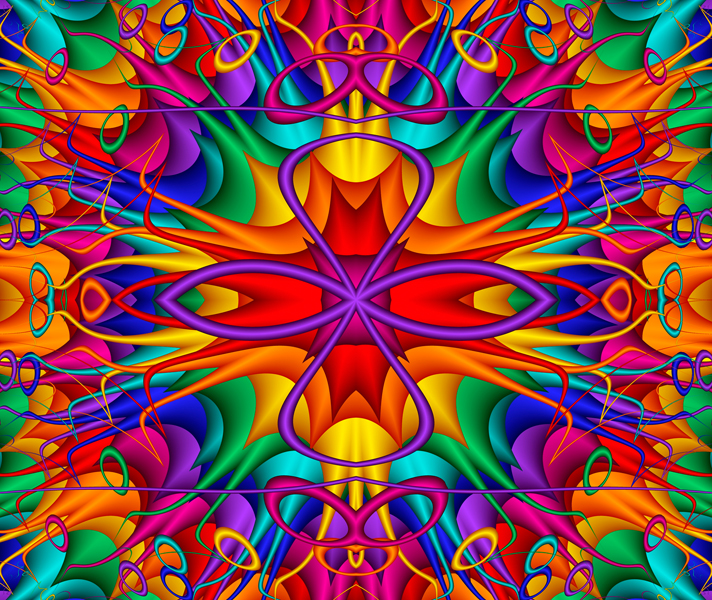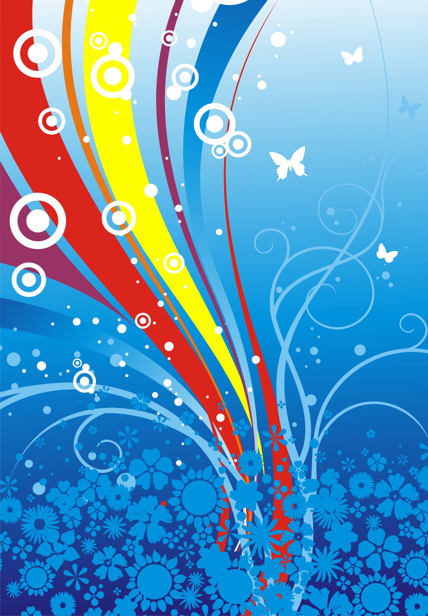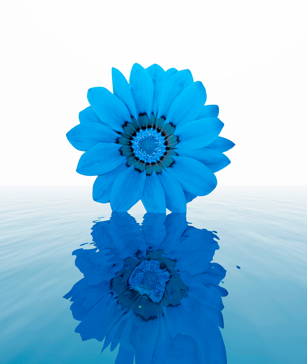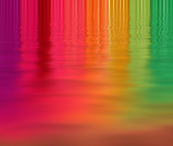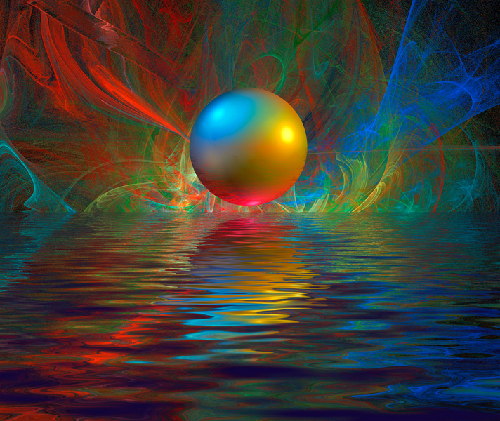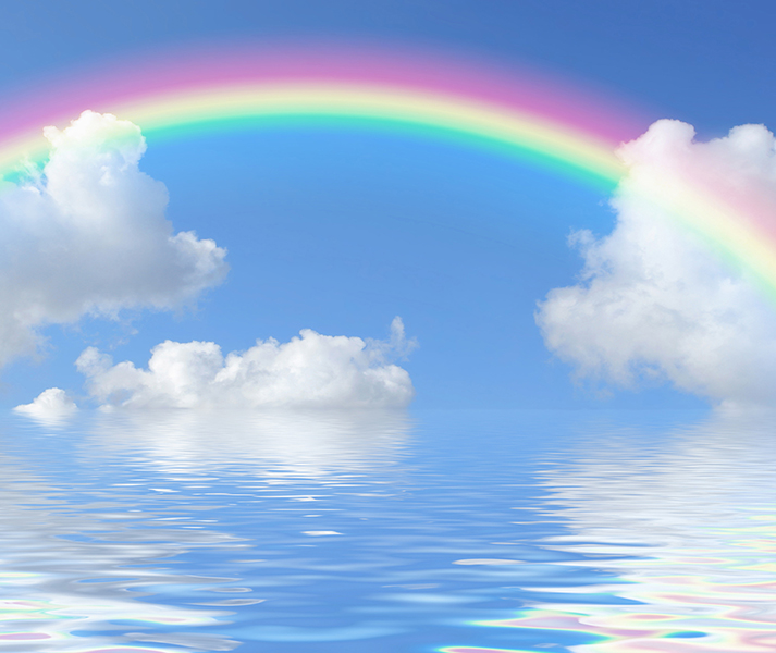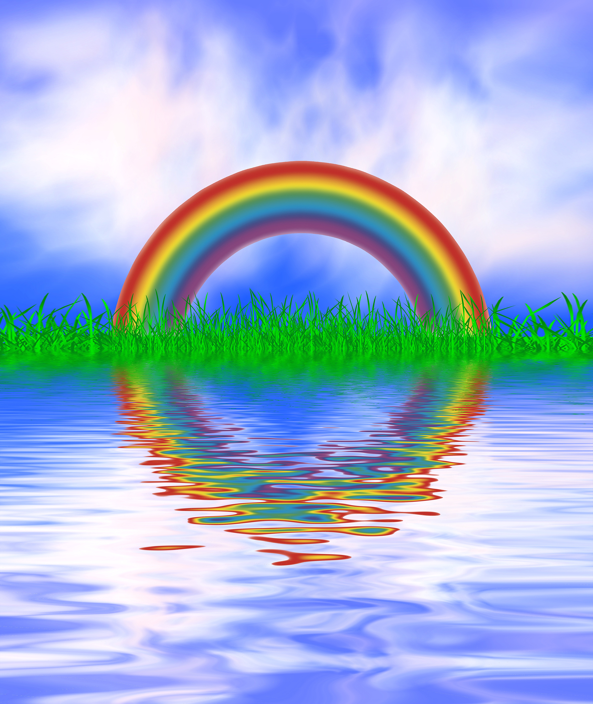 Fantasy abstract of a blue sky with a rainbow and cumulus clouds, reflected over water.