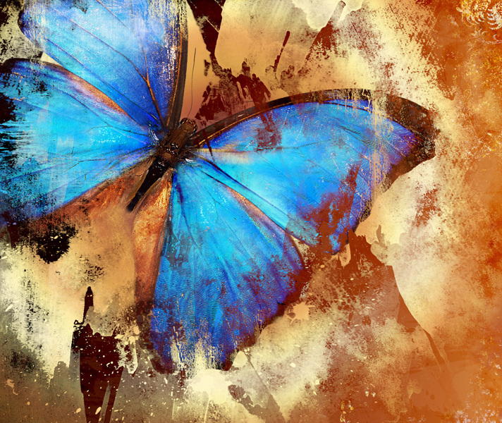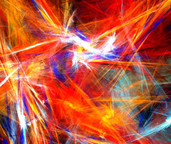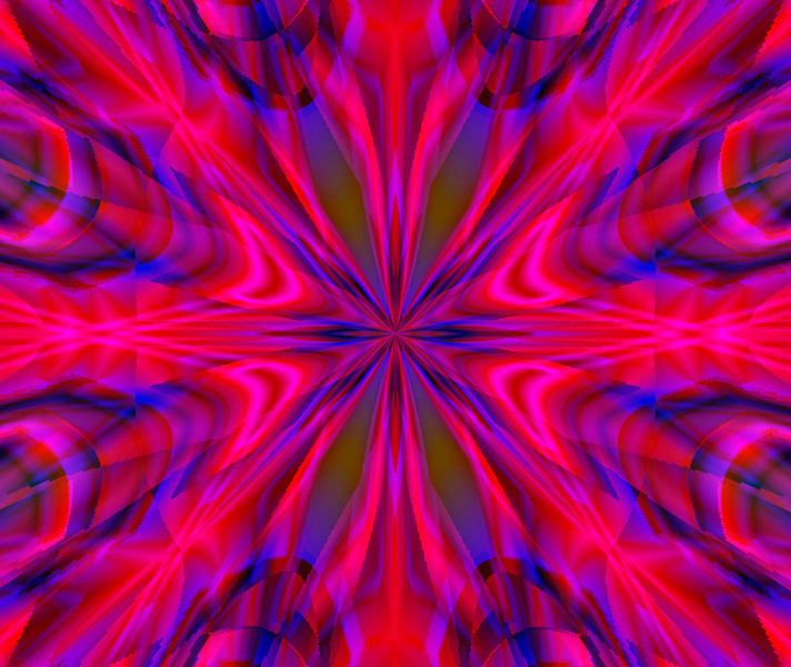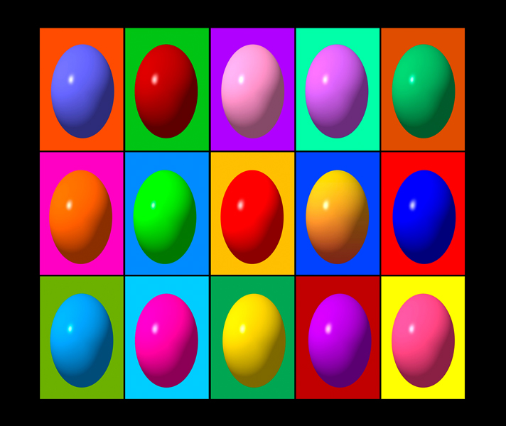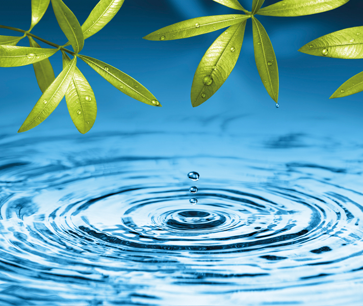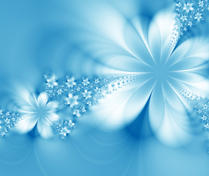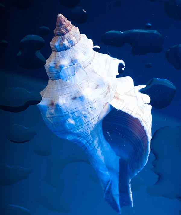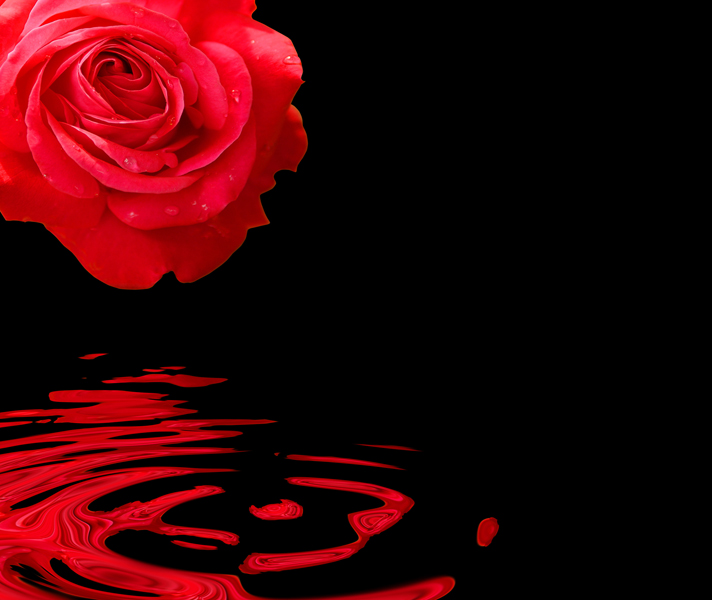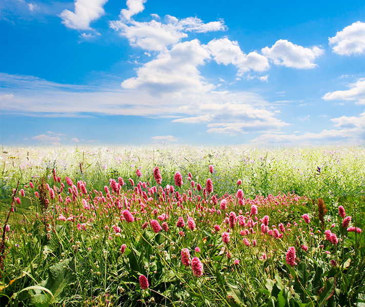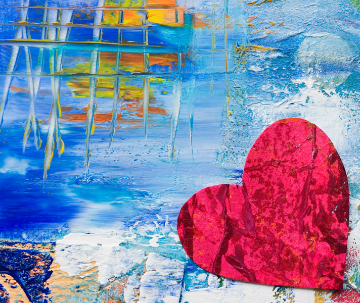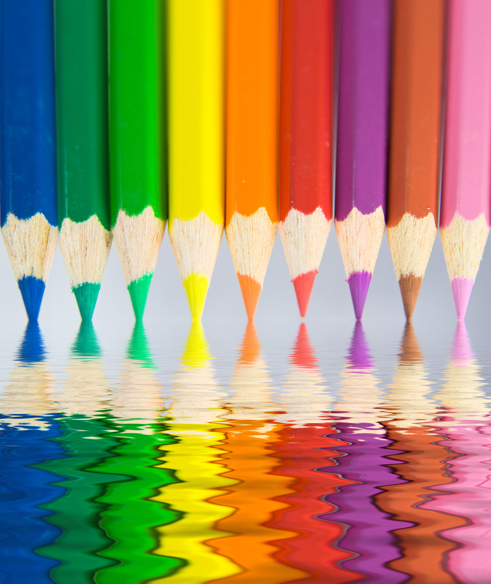 Fantasy abstract of a blue sky with a rainbow and cumulus clouds, reflected over water.