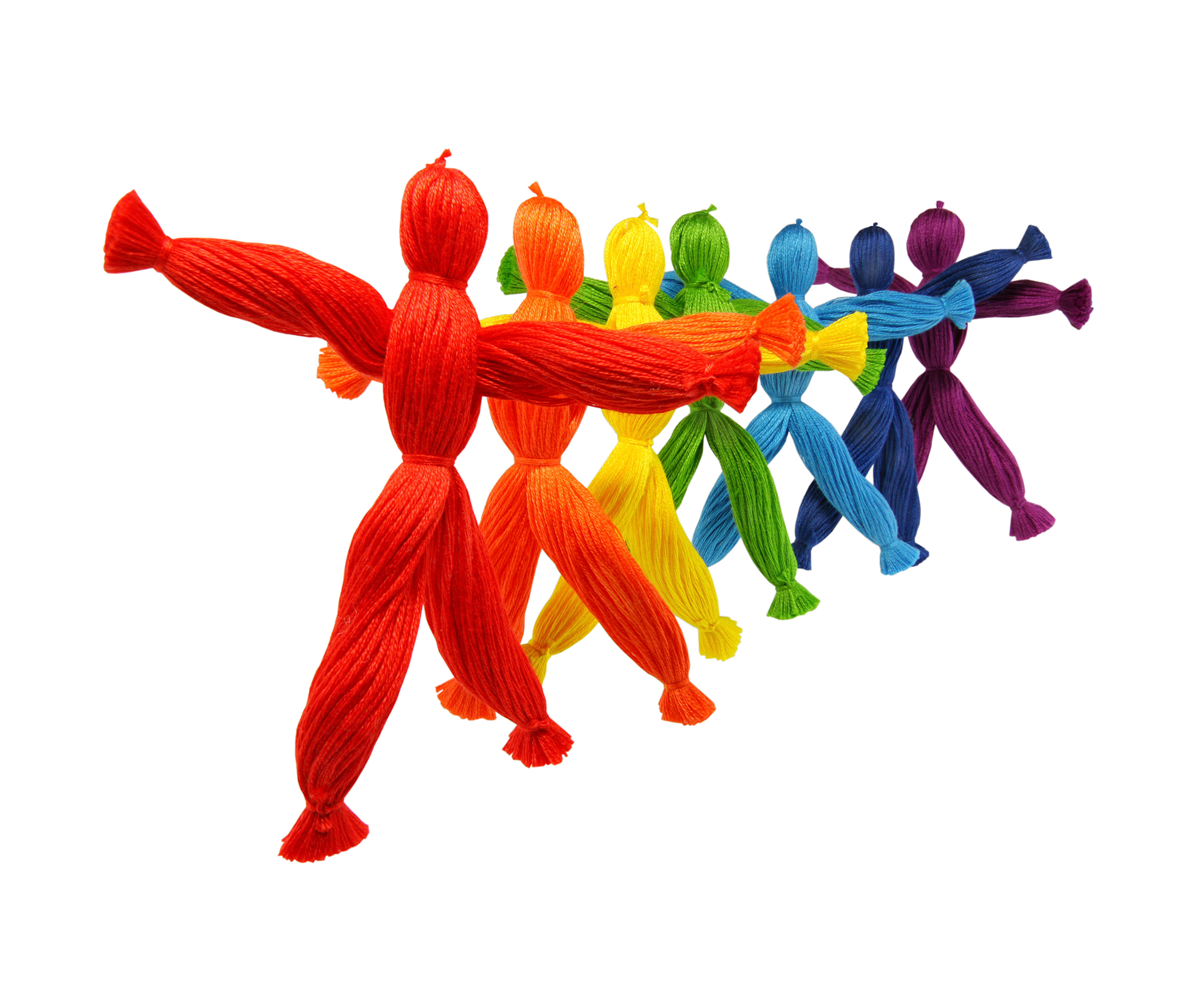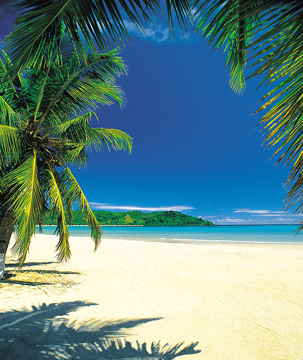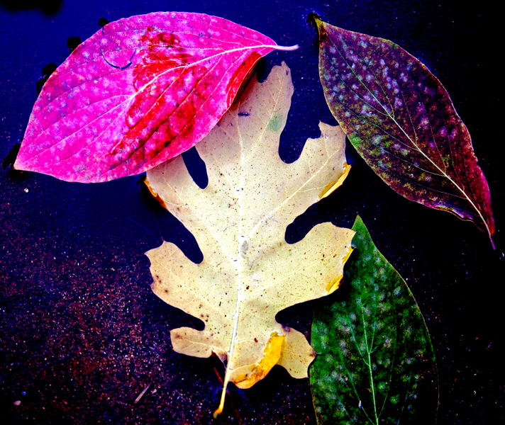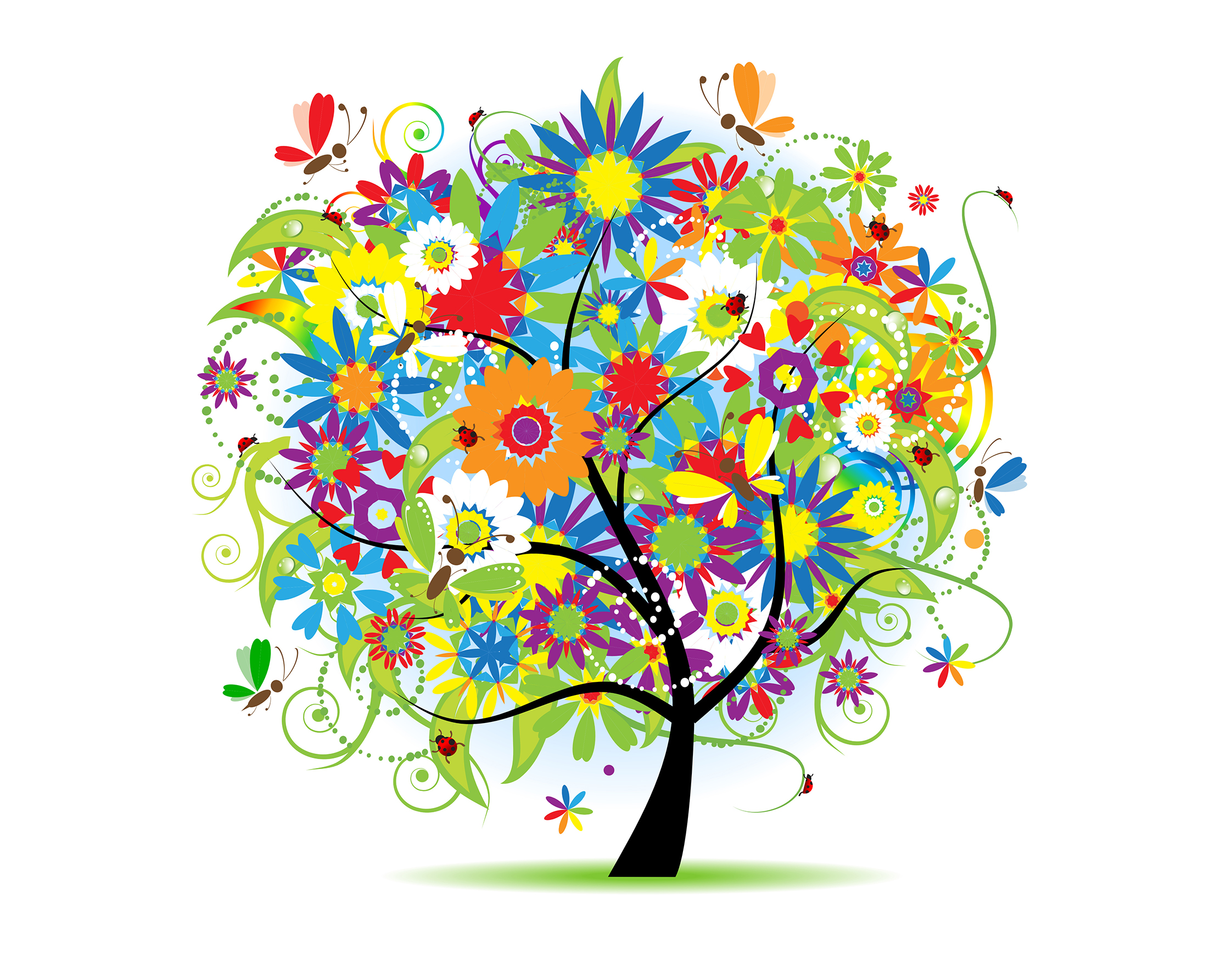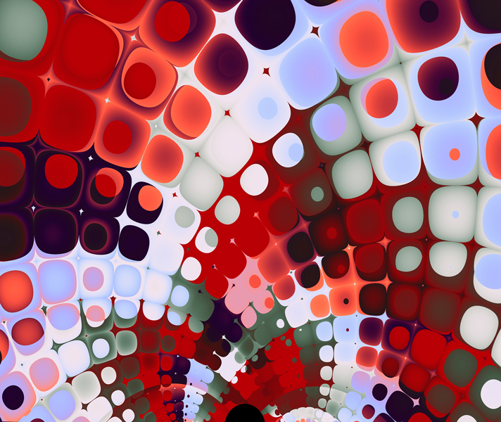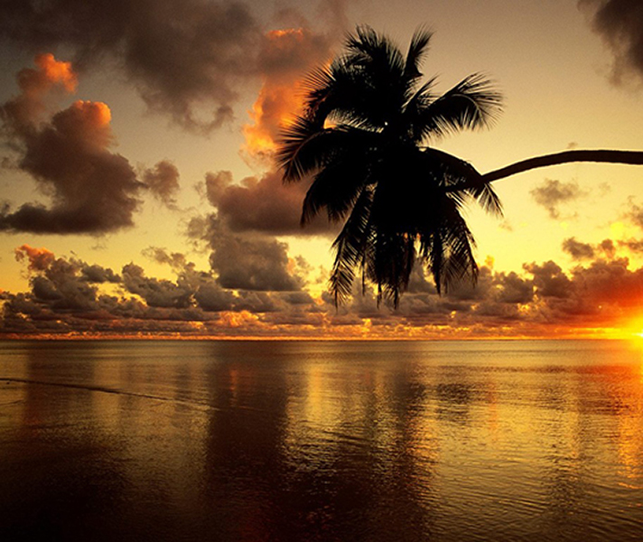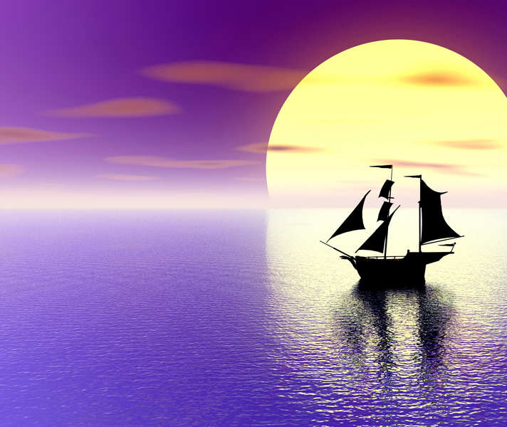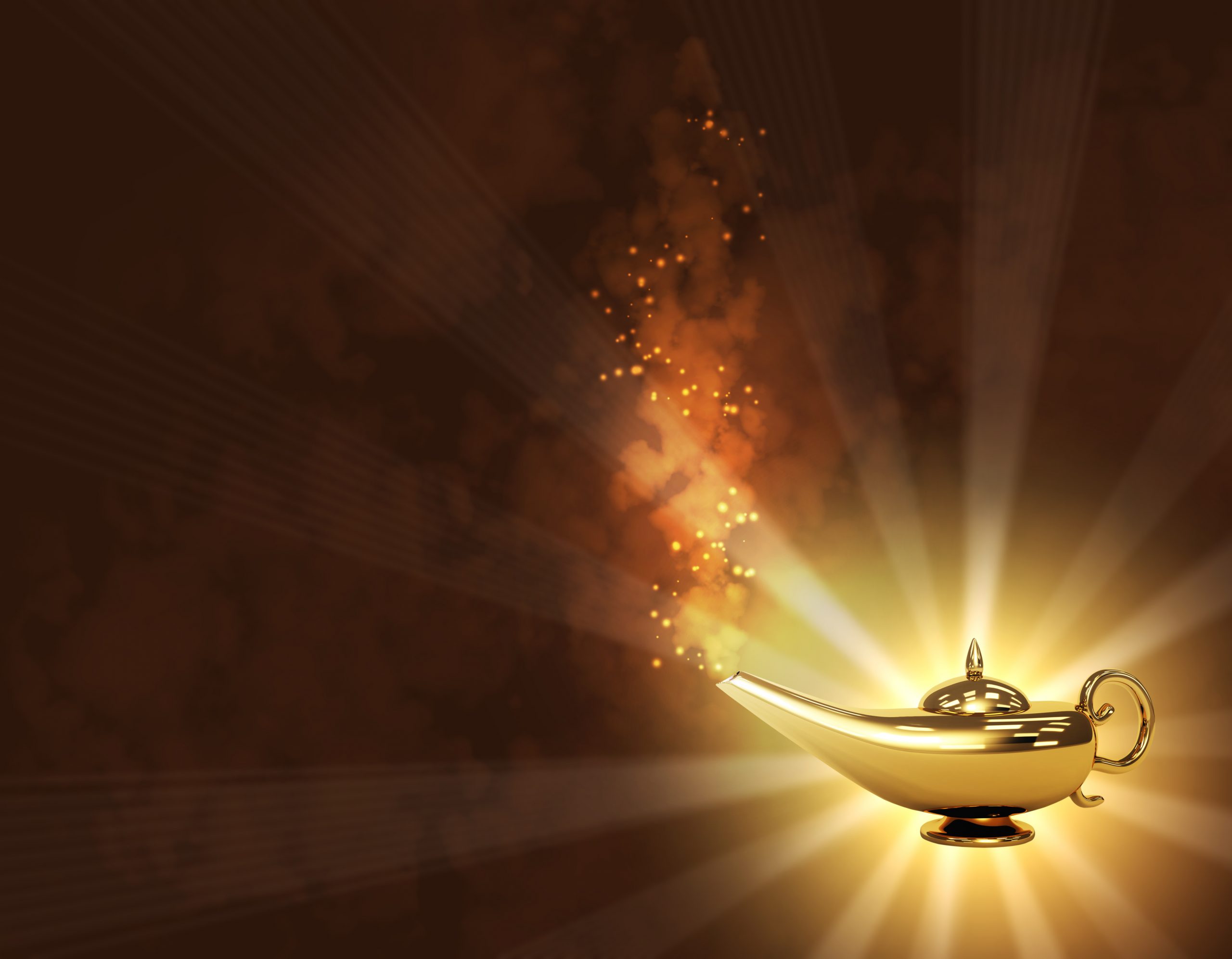 Fantasy abstract of a blue sky with a rainbow and cumulus clouds, reflected over water.