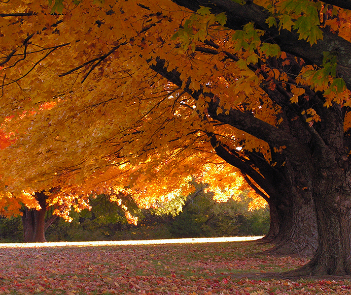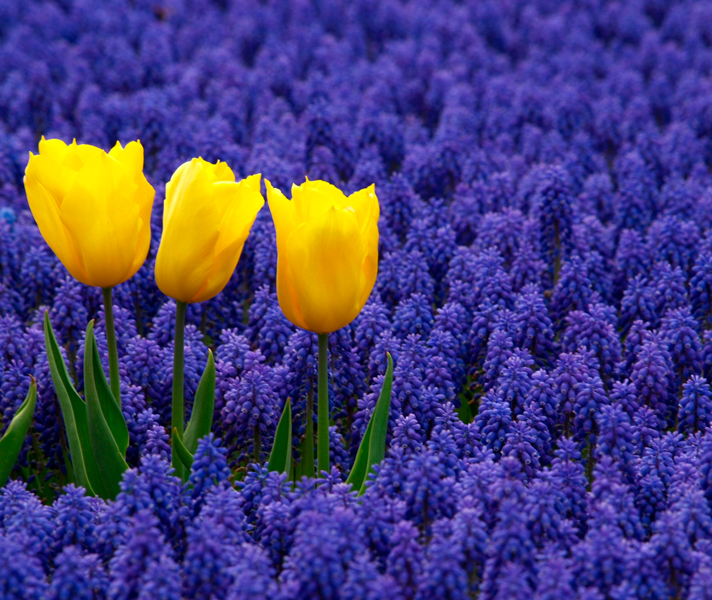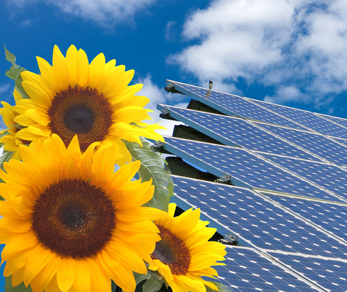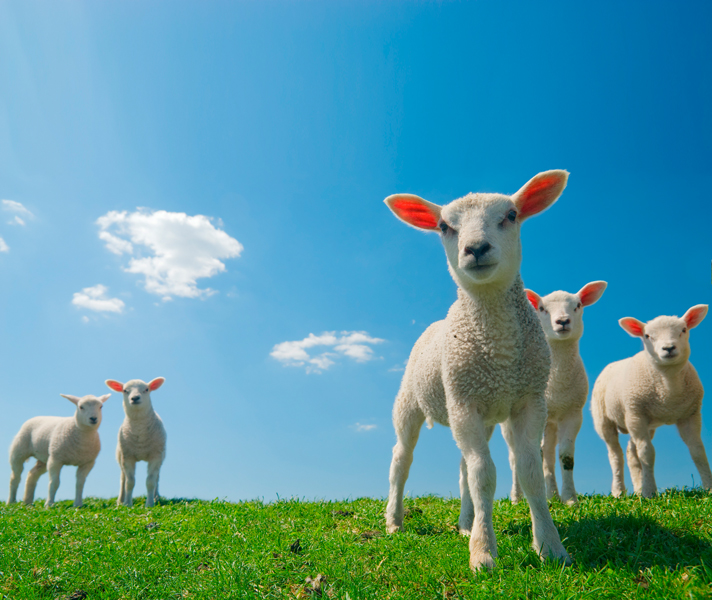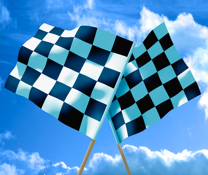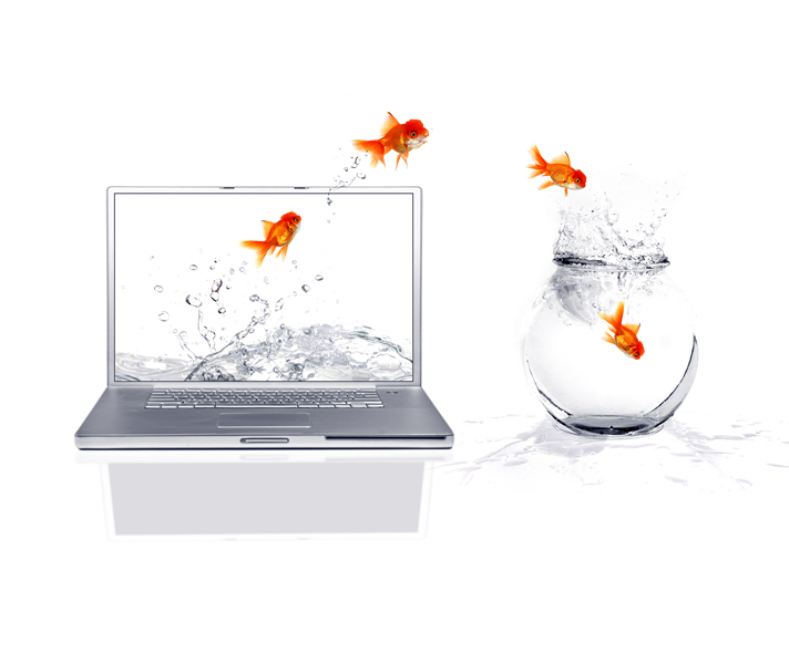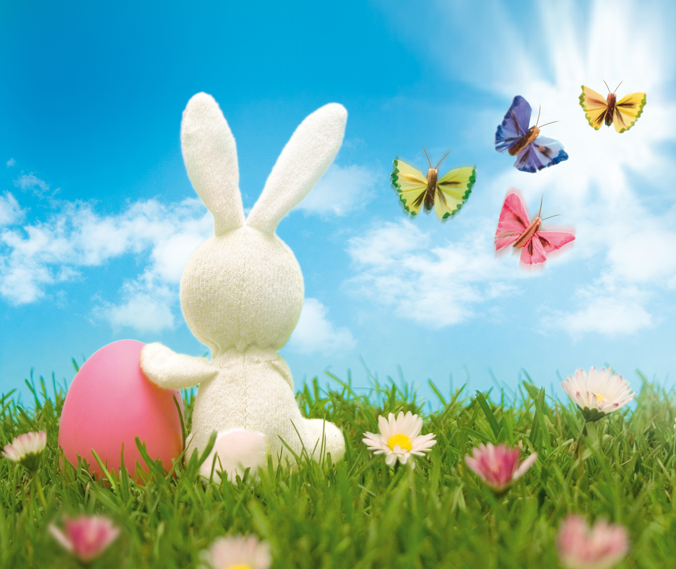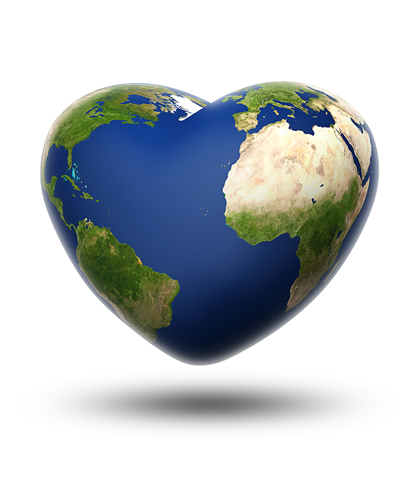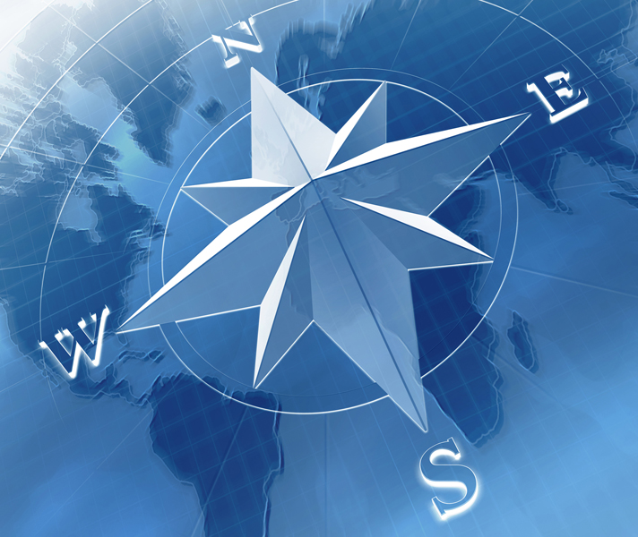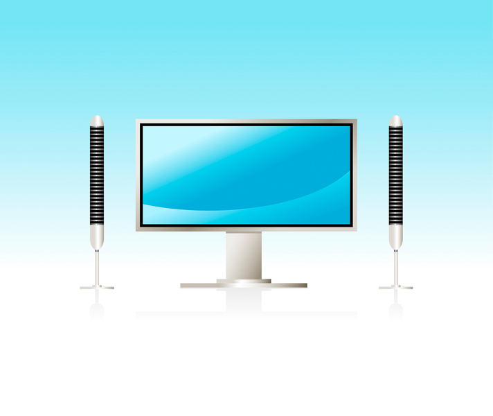 Fantasy abstract of a blue sky with a rainbow and cumulus clouds, reflected over water.