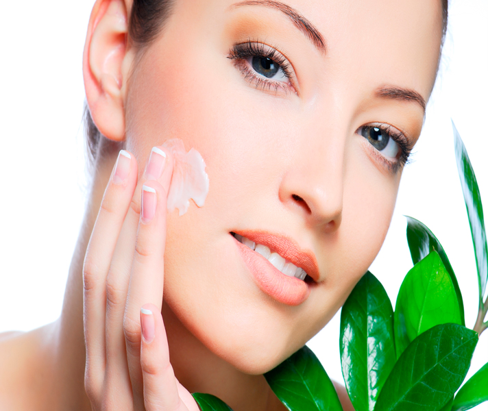 Woman applying moisturizer cream on face. Close-up fresh woman face.