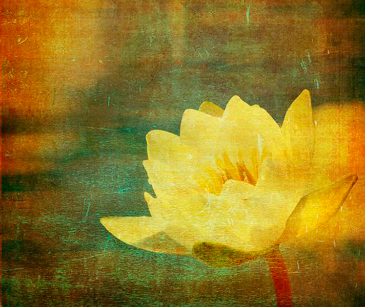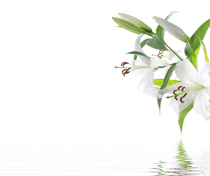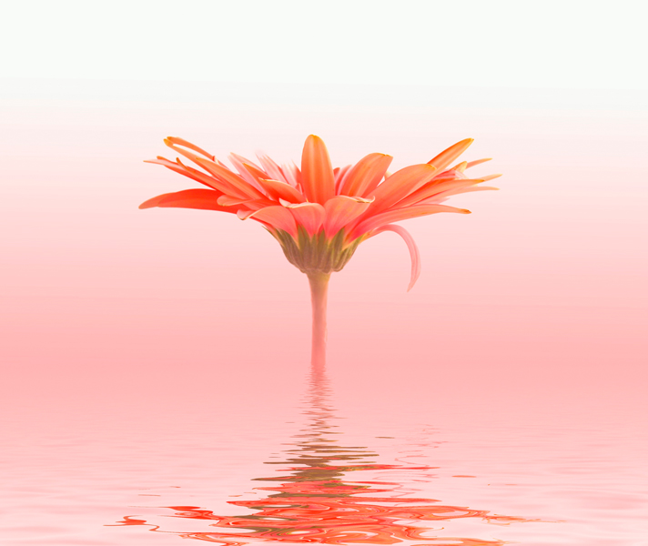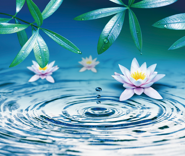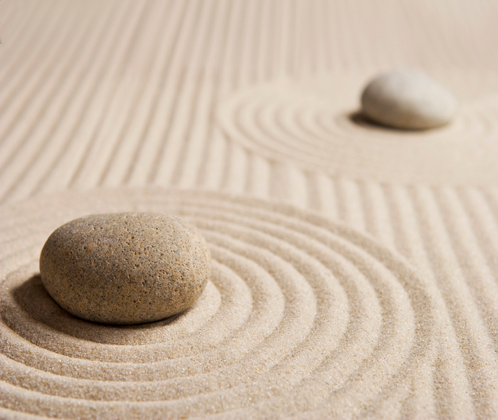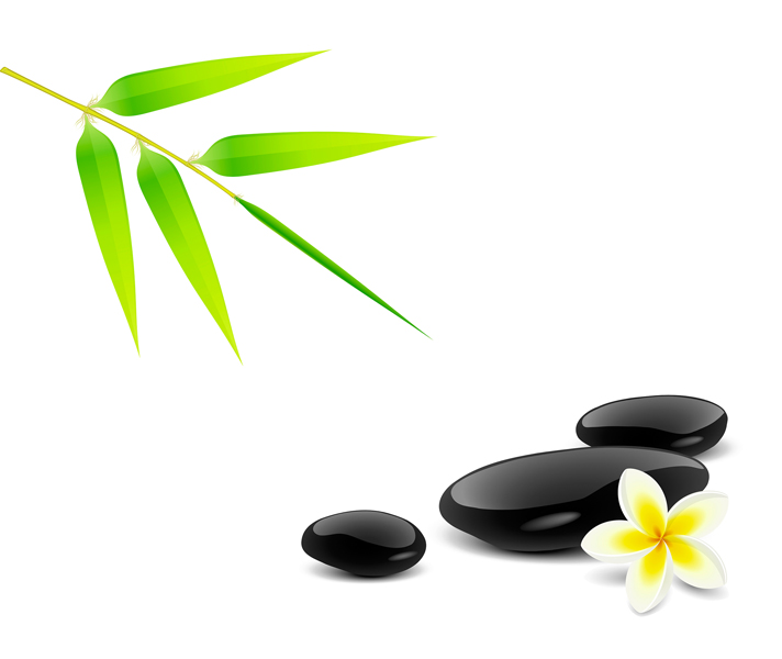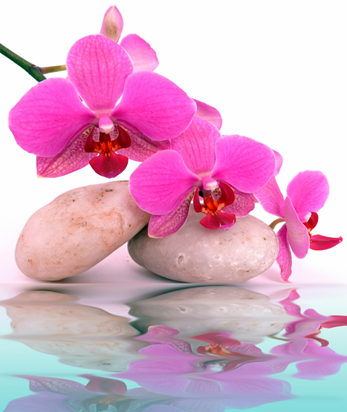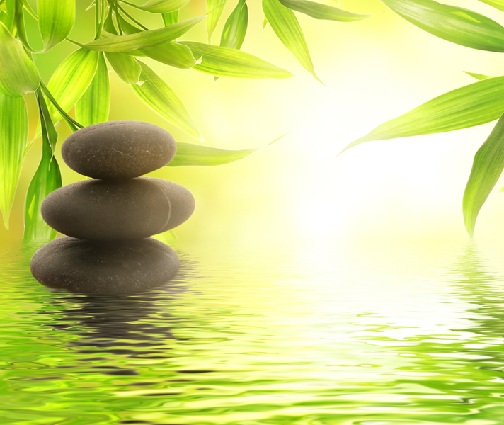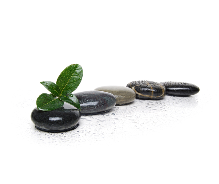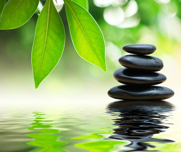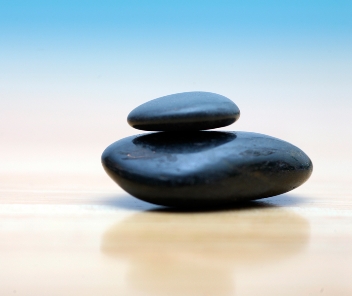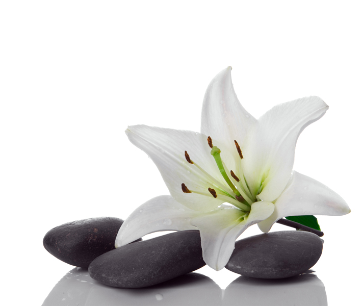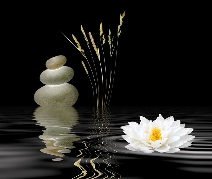Abstract of three natural grey pebbles balanced on top of each other, with a selection of wild grasses to one side reflected over gray rippled water with a white lotus lily to one side. (Gladstoniana genus.) Set against a black background.