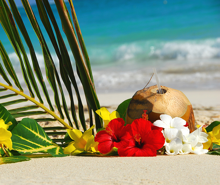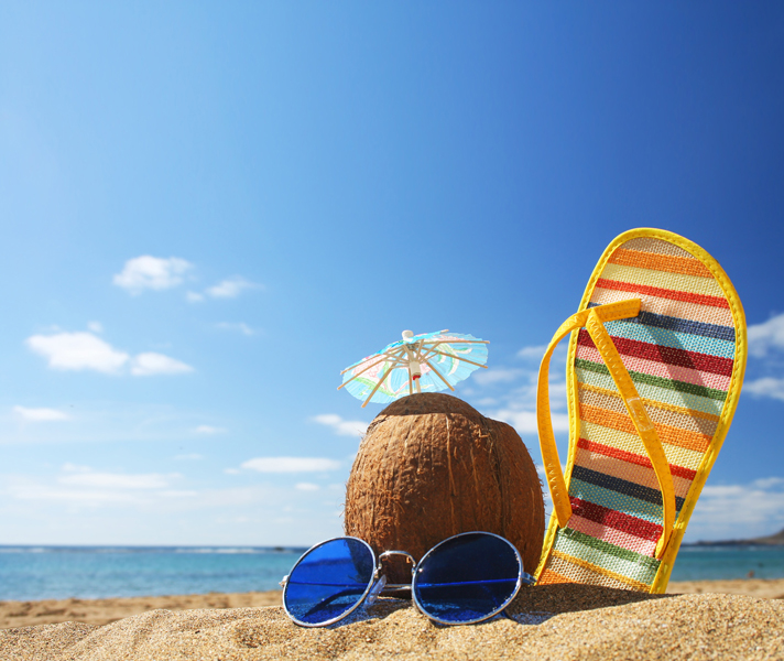 Stilllife on the beach with sunglasses cocktail in coconut and flip flop
