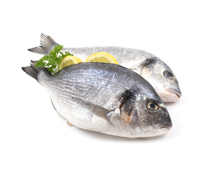close-ups of two dorada fish with lemon and parsley isolated on white