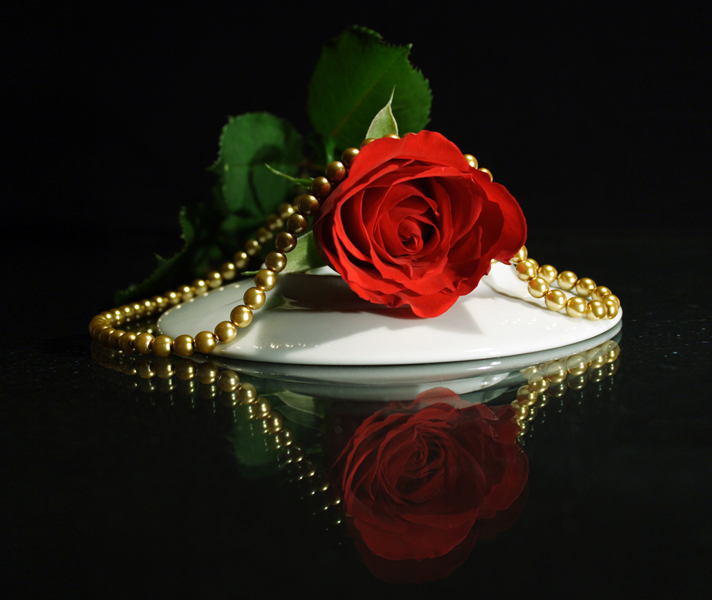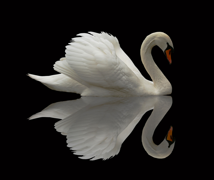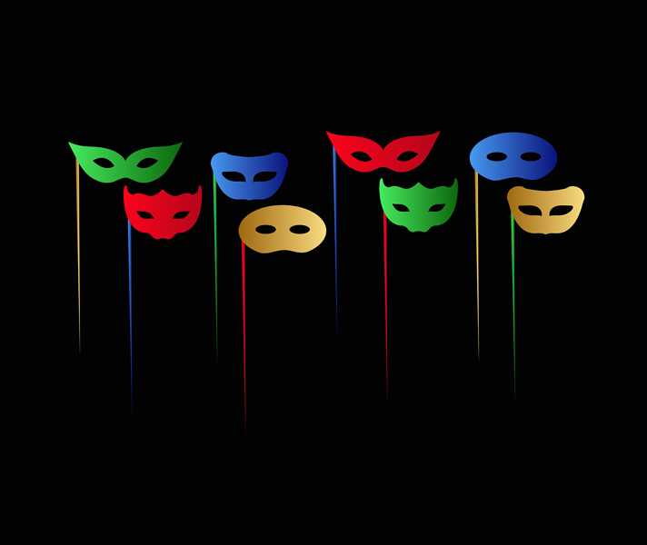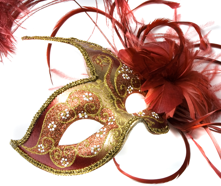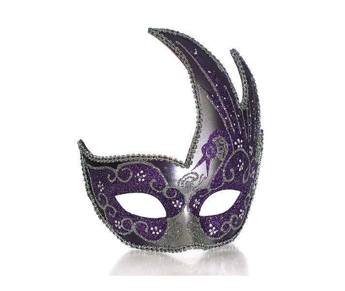 A fancy venetian mask shot against a white background with part of it’s reflection in front
