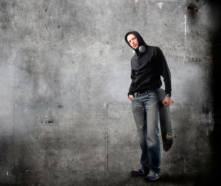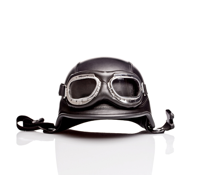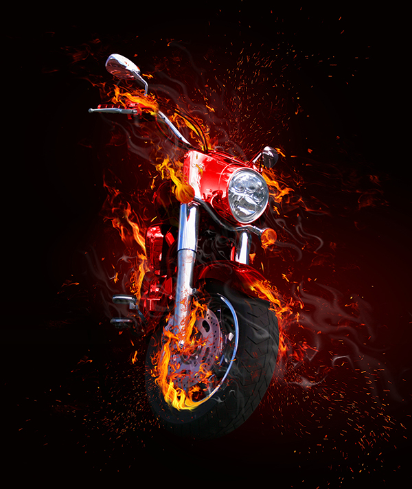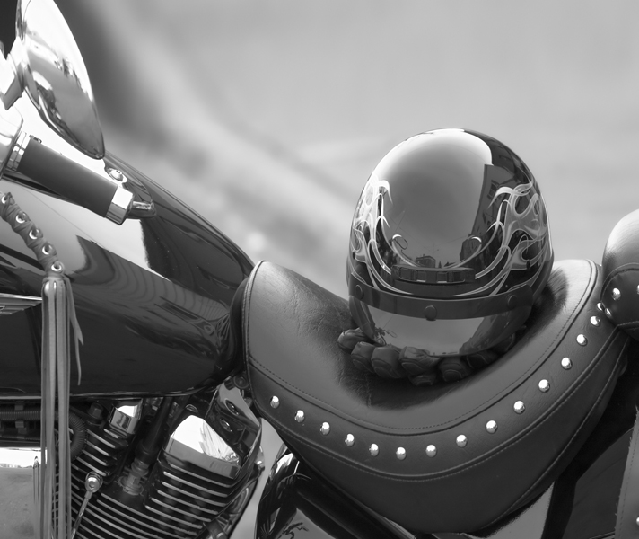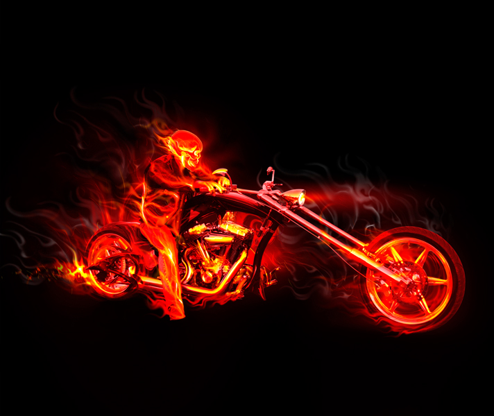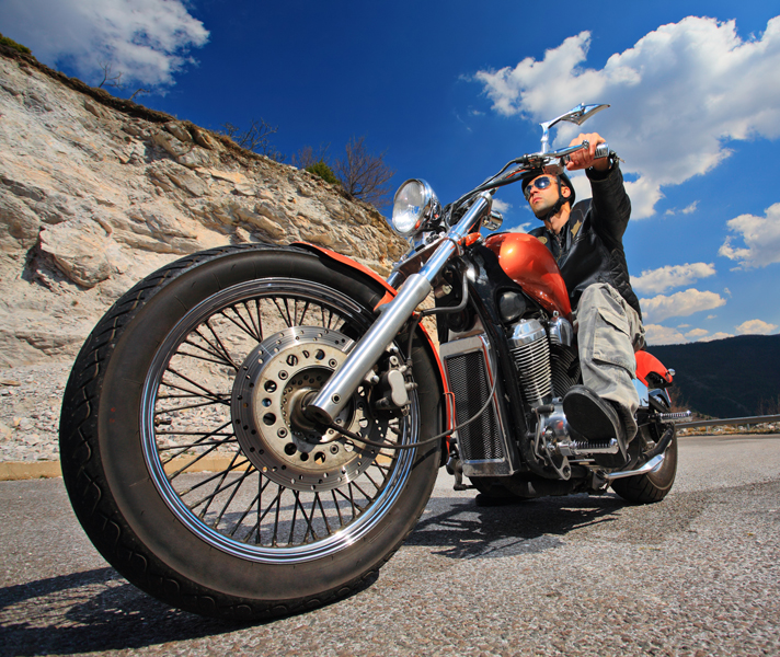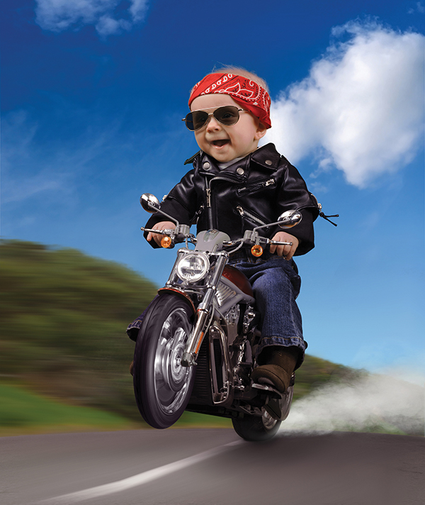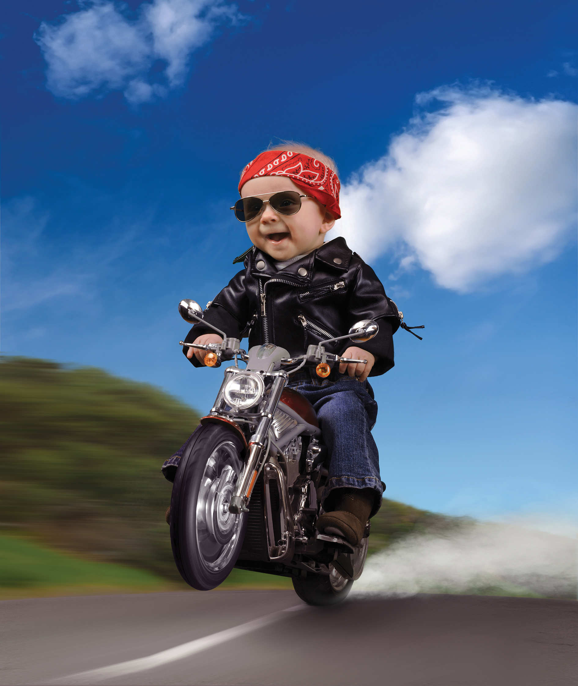 Baby dressed as a biker, popping a wheelie on a motorcycle