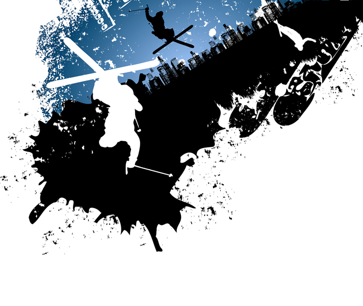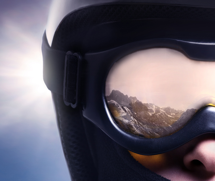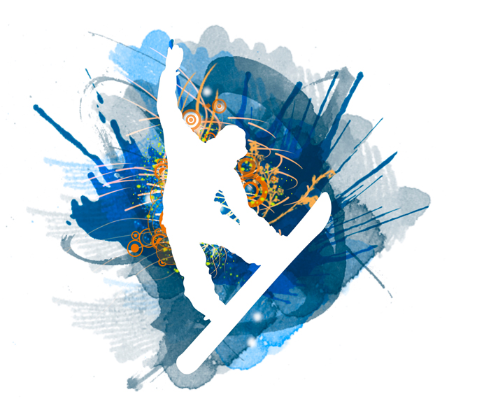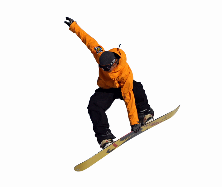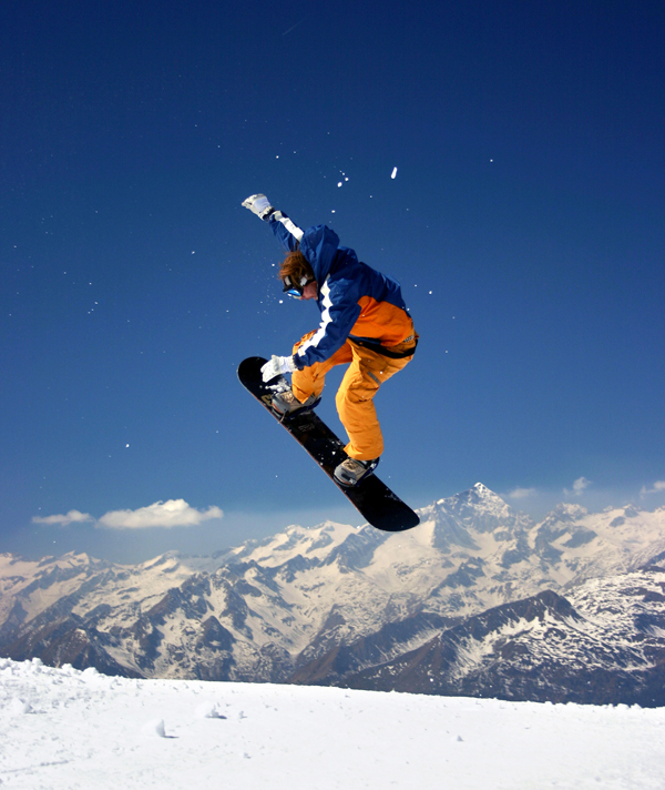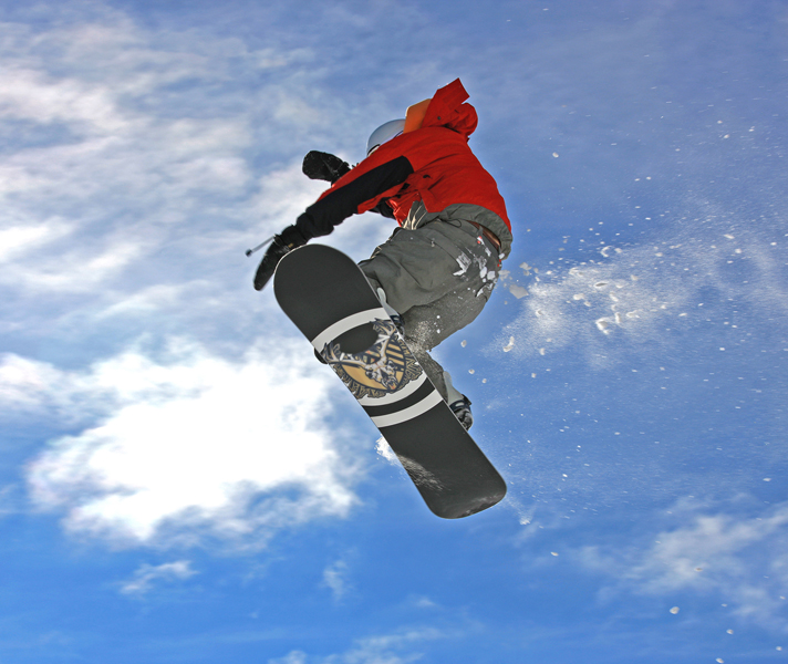 Snowboardfahrer mit roter Jacke hoch in der Luft fliegend