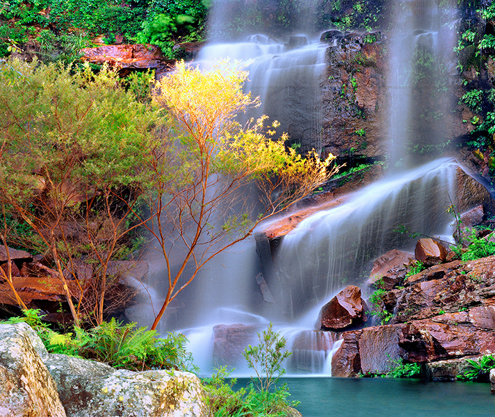 With natural untouched vegetation all around and huge rock faces a waterfall flowing down from the mountains cascades over the rock face and down into the creek below
