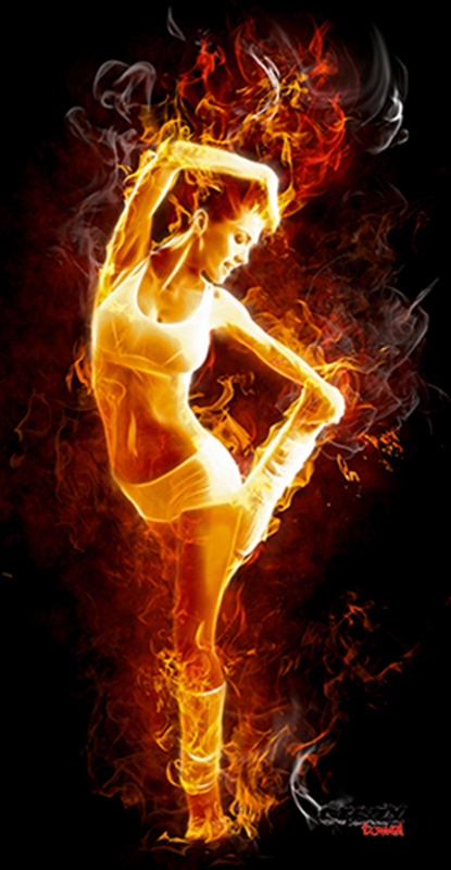 931 Toalla Dance. Diseño con foto de bailarina envuelta en llamas de fuego. Fondo negro en el que predominan las llamas del fuego. Toalla regalo ideal para ocasiones especiales. Toalla divertida en diferentes tamaños, playa, ducha, piscina, etc.