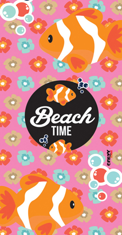 Toalla 1291 Beach Time Rosa personalizable de microfibra o rizo algodón. Impresión digital con calidad fotográfica. Estampado peces y flores sobre fondo rosa.