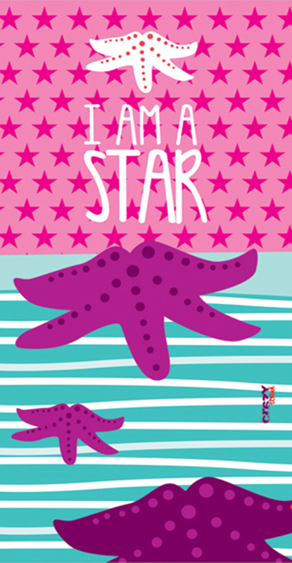 Toalla 1293 I am a Star Pink personalizable de microfibra o rizo algodón. Impresión digital con calidad fotográfica. Fondo con estrellas y peces naranja.