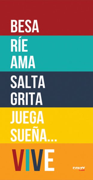 1299 Toalla Vive Turquesa personalizable de microfibra o rizo algodón. Fondo de rayas de colores, palabra VIVE y texto en blanco.